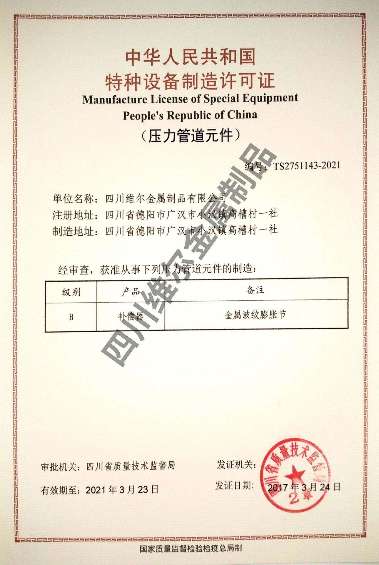 中华人民共和国特种设备制造许可证