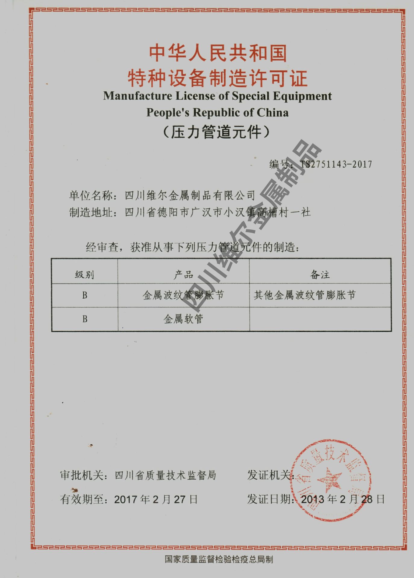 中华人民共和国特种设备制造许可证